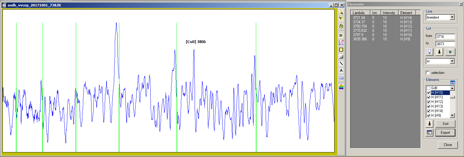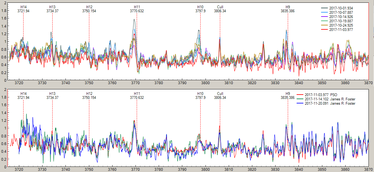 And, here is the H12-H9 region, having Alp Ori 1:1 subtracted (normalised for 3780-3785) and +0.5 value added for PlotSpectra, showing my serie and last 2 ones from James Foster + my last on Nov.03: