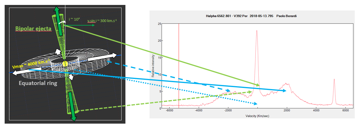 1. Ejection d'anneau équatorial (pied large) et de lobes bipolaires (composant étroit). Dans la cas de V392 Per, le composant étroit apparaît non dédoublé (voir spectres moyenne résolution de Paolo, Michel, Olivier), ce qui peut s'expliquer par une inclination trés faible du systéme (ordre de grandeur 10°)