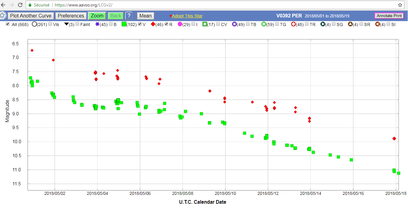 L'AAVSO donne encore une magnitude de 10 le 18 mai dans le rouge.