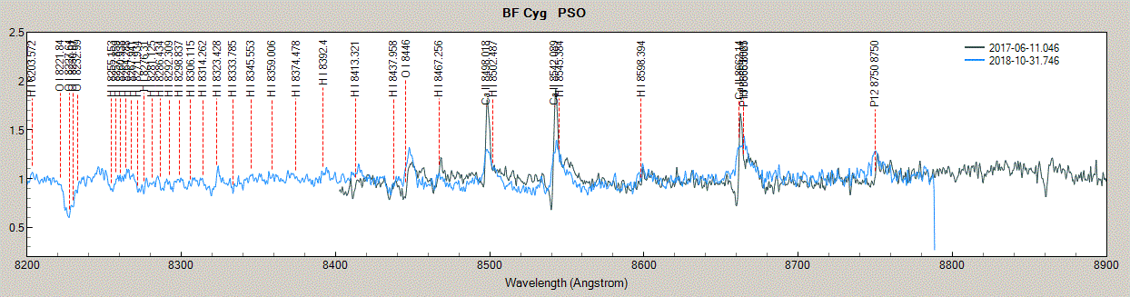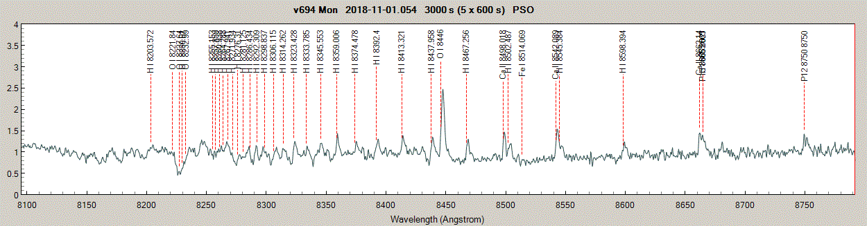 I have just managed to gather further results (Ca II triplet + O I 8446 region, but O I 7774-76 was left off, my ccd is not enough large), so let me extend this collection with further - mainly - symbiotics: My resolution was typically R~2700 (35 micron slit, LHires III + 600/mm Vis + Orange wratten filter directly on top of the ccd), lower than Michael's R~3688. BF Cyg was suffered by defocus both (R~2200): Vend47 is starting to show the Paschen end: And, the one I was most curious (only 5 x 10 minute, of last covered by veily clouds): v694 looks to be a good school example to see how the CaII and Paschen end overlap (the notation of H I .... and P 12,13 brought from VSpec via copy/paste), here all in emission.