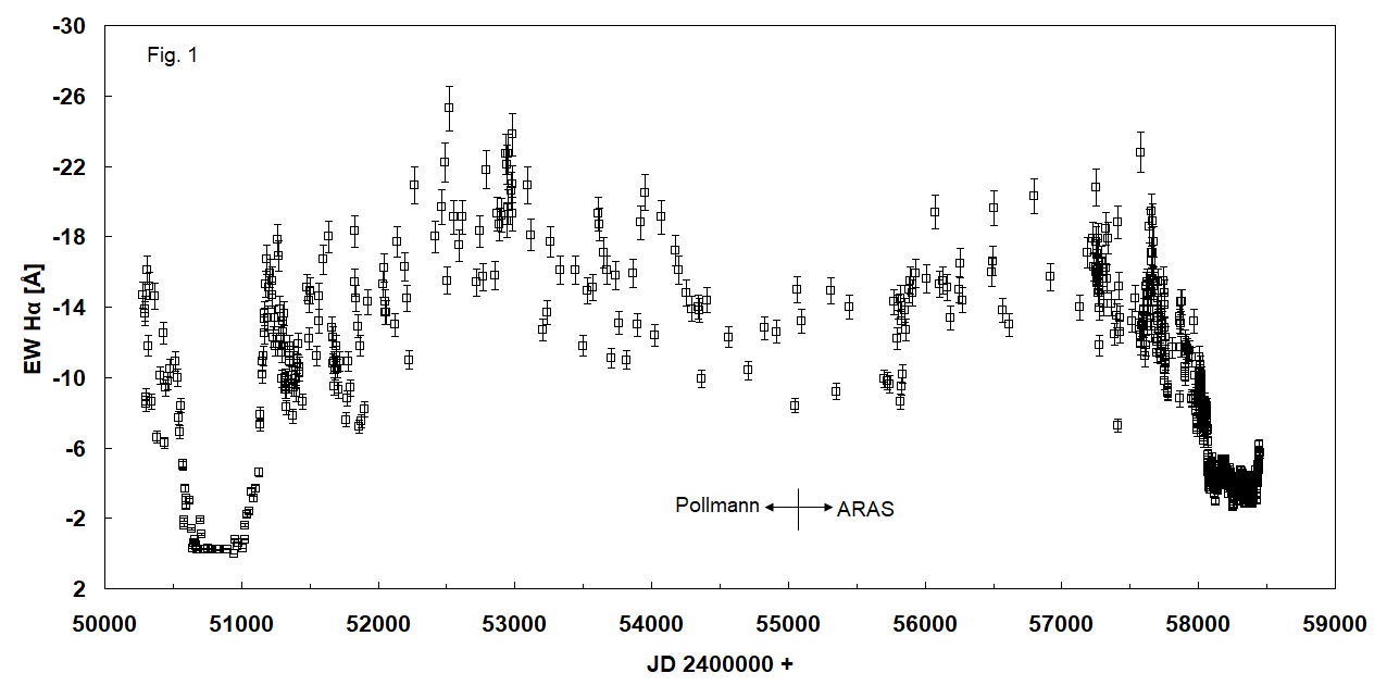 To determine if it was maybe an inclination change, my suggestion was to get the barycenter of H-alpha profile high velocities region (170-400 km/s) in longterm, and follow its velocity change: