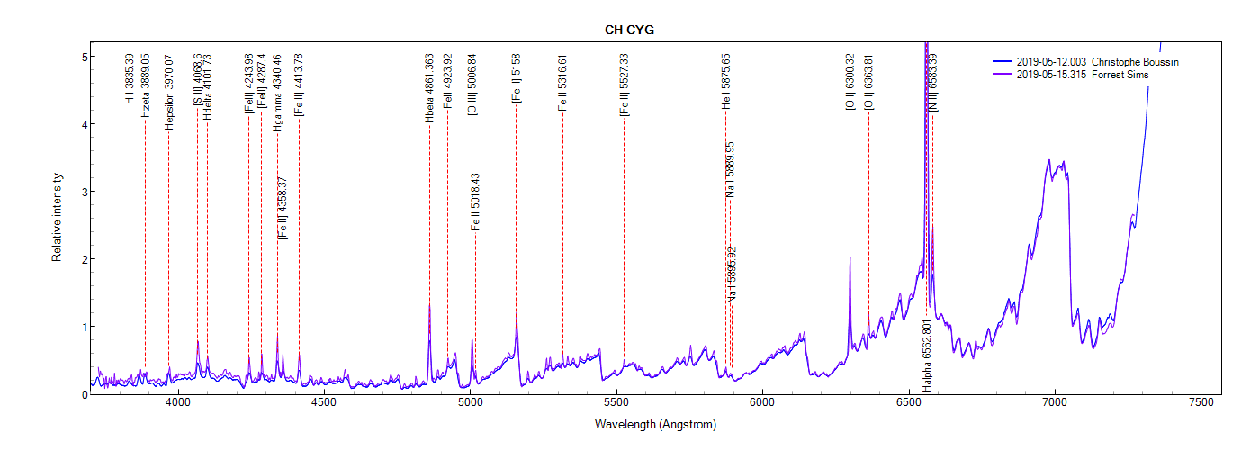 Just to highlight the effect of the resolution on the detection of spectral lines, here is a comparison of the Forrest Sims spectrum (LISA) of CH Cyg with mine (Alpy).