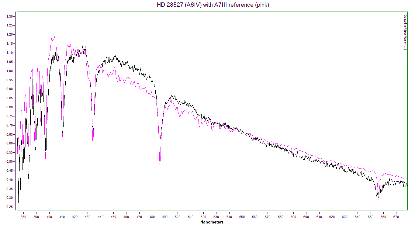 The common reference is, in fact, the dispersion, which doesn’t change. I begin by building a polynomial using the Balmer lines from an A-type star. Then I add in the Ca II K and H lines and Na I D line from an F- type star At this point I have a polynomial function for the dispersion, which is the same for all stars. I calibrate an unknown star using one point: H-beta for stars O-A, Ca I K for F-type stars and Na I D for K-type and G-type. I don’t need to know the spectral type of the unknown star, I have never had a problem with trial and error. All these spectra were taken with a simple easy to use system: Borg 55mm on a camera tracker. No guiding. 5-10s exposures acquired with ASI290MM-Cool and stacked.