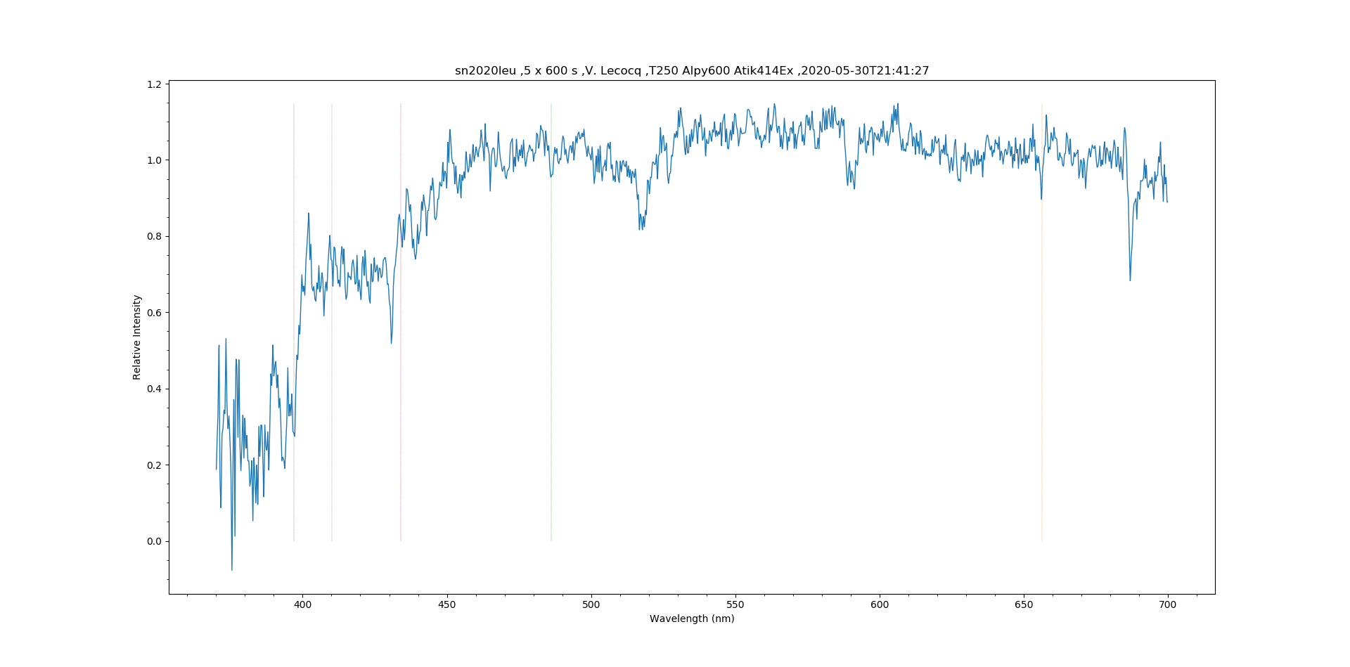 I took another 2 sets of spectra of the target last night - because clouds came and went I only managed one set early in the evening when the target was quite low and another near the meridian. The later images weren't particularly clear so I have presented the spectrum from early on 30 May and another spectrum from the previous day.