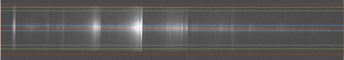 Ci-dessous une image brute du spectre pour montrer la problématique du fond du ciel sur un Alpy équipé d’une double fente. La partie 23micrion est donc encore plus courte que la normale. Sans trop réfléchir, j’ai donc essayé de caler la cible à la limite de la fente large pour laisser le plus de marge possible en bas de la fente étroite pou le fond du ciel. Ceci m’a conduit à un choix dissymétrique des zones de binning présenté ci-dessous . Je ne sais pas si c’était la bonne solution. Il faut déjà noter ici la forte amplitude de la raie CN 3883 qui vient malheureusement déborder sur ce qui devrait être le fond du ciel.