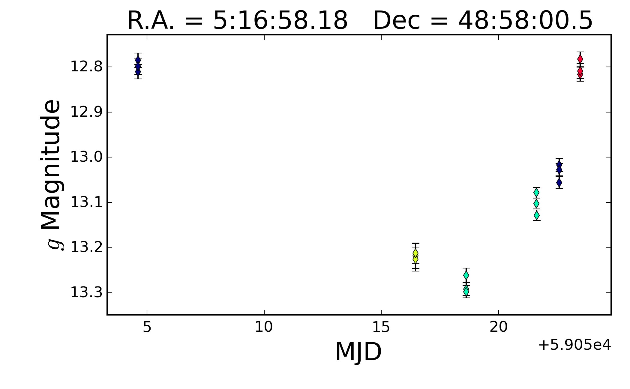 Has brightened from mag 13.3 to 12.8, not previously variable.