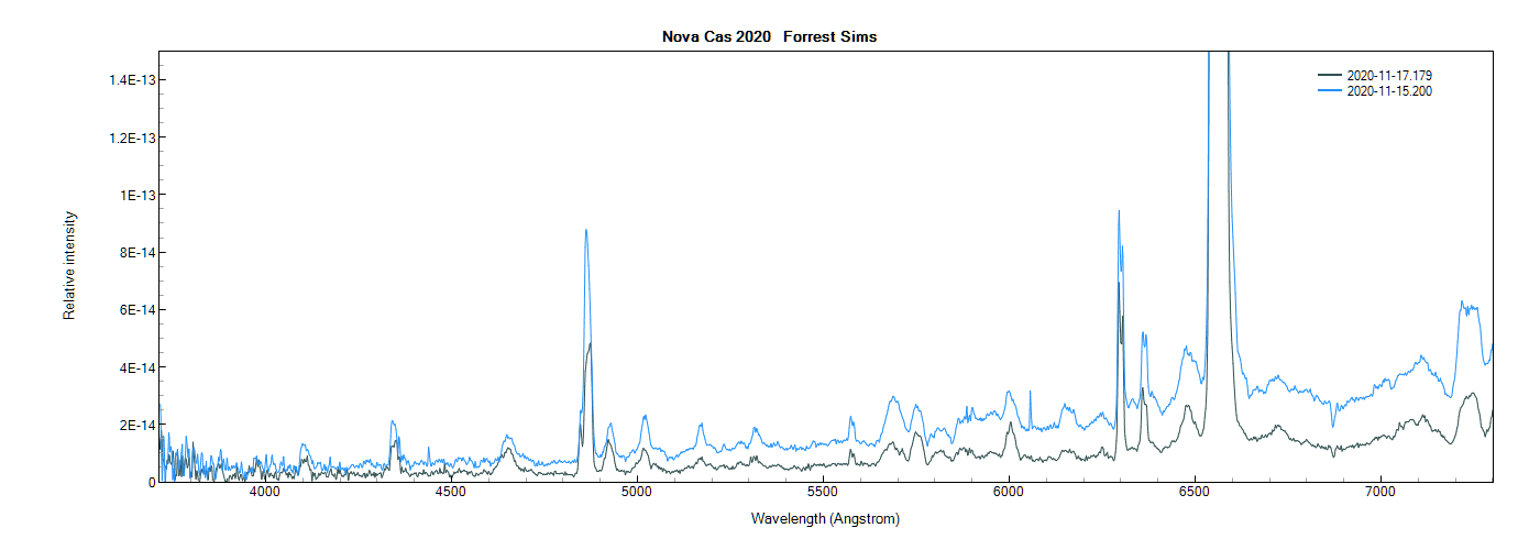 Nova Cas 2020 continues to change rapidly and is well worth following. Here are recent flux calibrated spectra taken just two days a part. Nova Cas 2020 has dimmed by nearly 3 magnitudes in the V band in the past week.