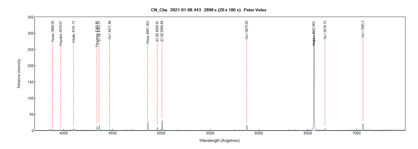 The weather has finally cleared and I managed a few images of CN Cha earlier this week. Here is the spectrum with a few lines marked. There are quite a few others but they don't show up easily given the scaling of the plot.