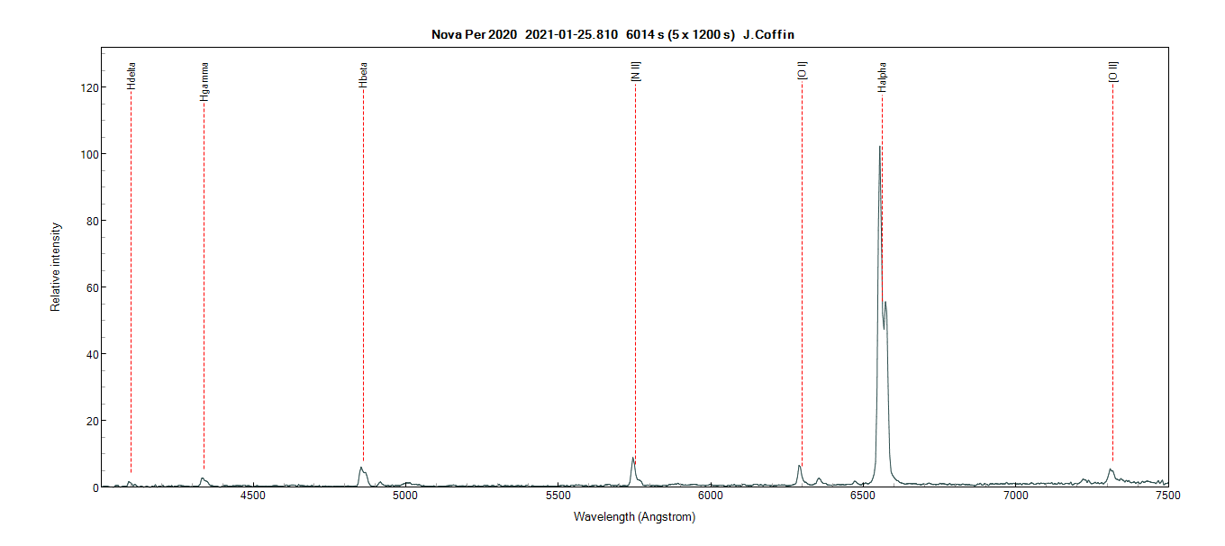 Here is my Alpy spectrum from 25th January. It is very noisy because this object is at magnitude 15.5 now. Most of the emission lines appear to have twin peaks, or look as if a higher resolution spectrum would show twin peaks. What could be the cause of this phenomenon?