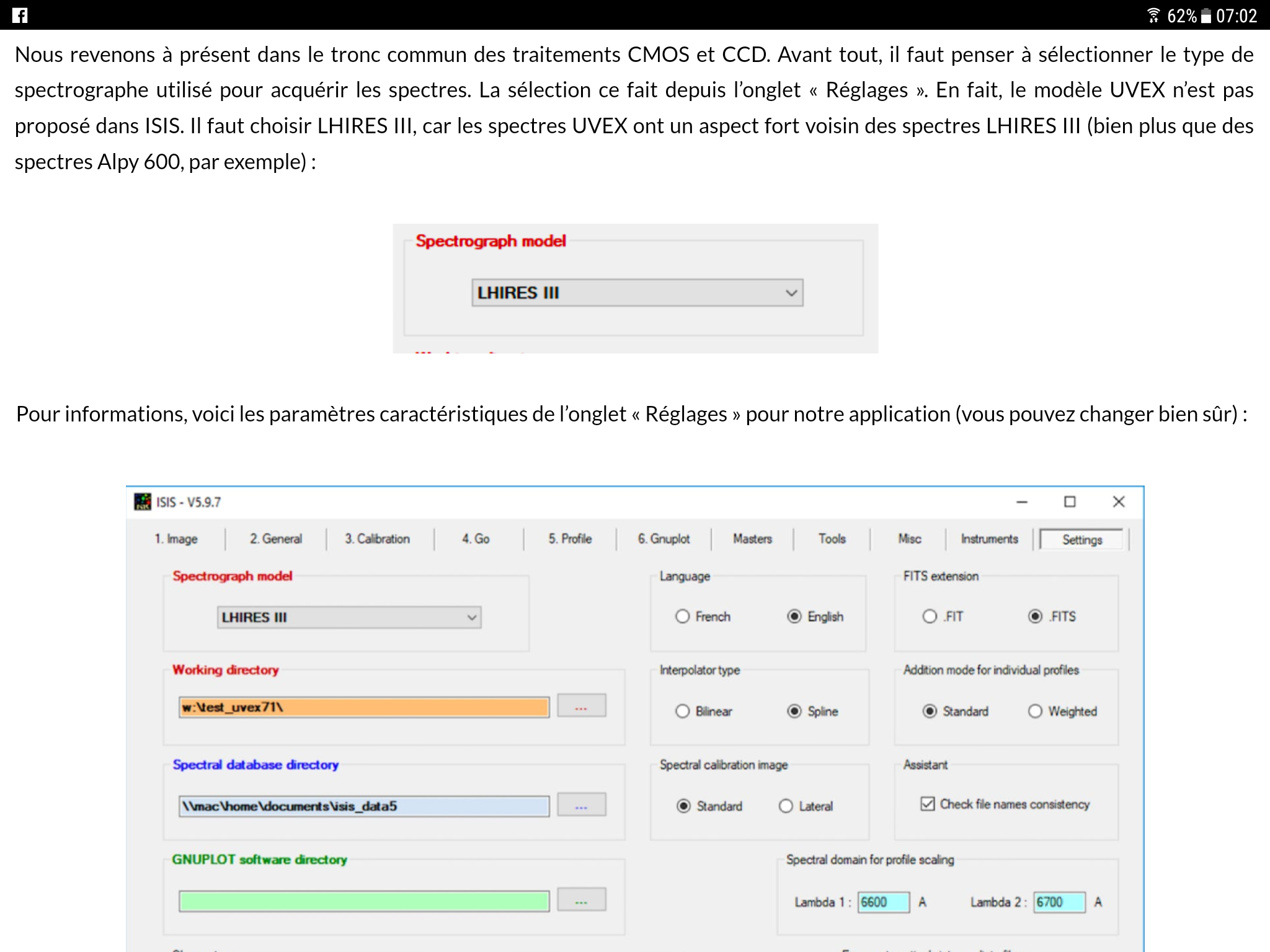 J'ai commencé la lecture de ton article "Traitement des spectres UVEX 300 traits/mm Caméra CMOS (ASI183MM)" sur le site du projet UVEX/Calibrex et je voudrais savoir comment paramétrer le logiciel de traitement ISIS utilisé (j'ai la version V6.0.0) dans l'onglet configuration le modèle de spectrographe : il y a 5 choix possibles du LhiresIII à l'Alpy 600, mais pas UVEX.... ?