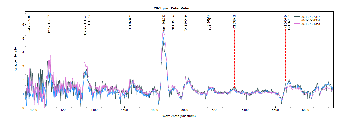 I attach a plot of my data from 4, 6 and 7 July. All spectra were taken with UVEX 600 lines/mm grating on PW CDK 12.5 with an Atik 460EX camera. Imaged from the iTelescope facility at Siding Springs Observatory Australia. Total integrations times varied from 4.5 hours (4 July) to 3 hours (7 July). I've had a stab at identifying a few of the more prominent lines but would welcome any suggestions/comments.