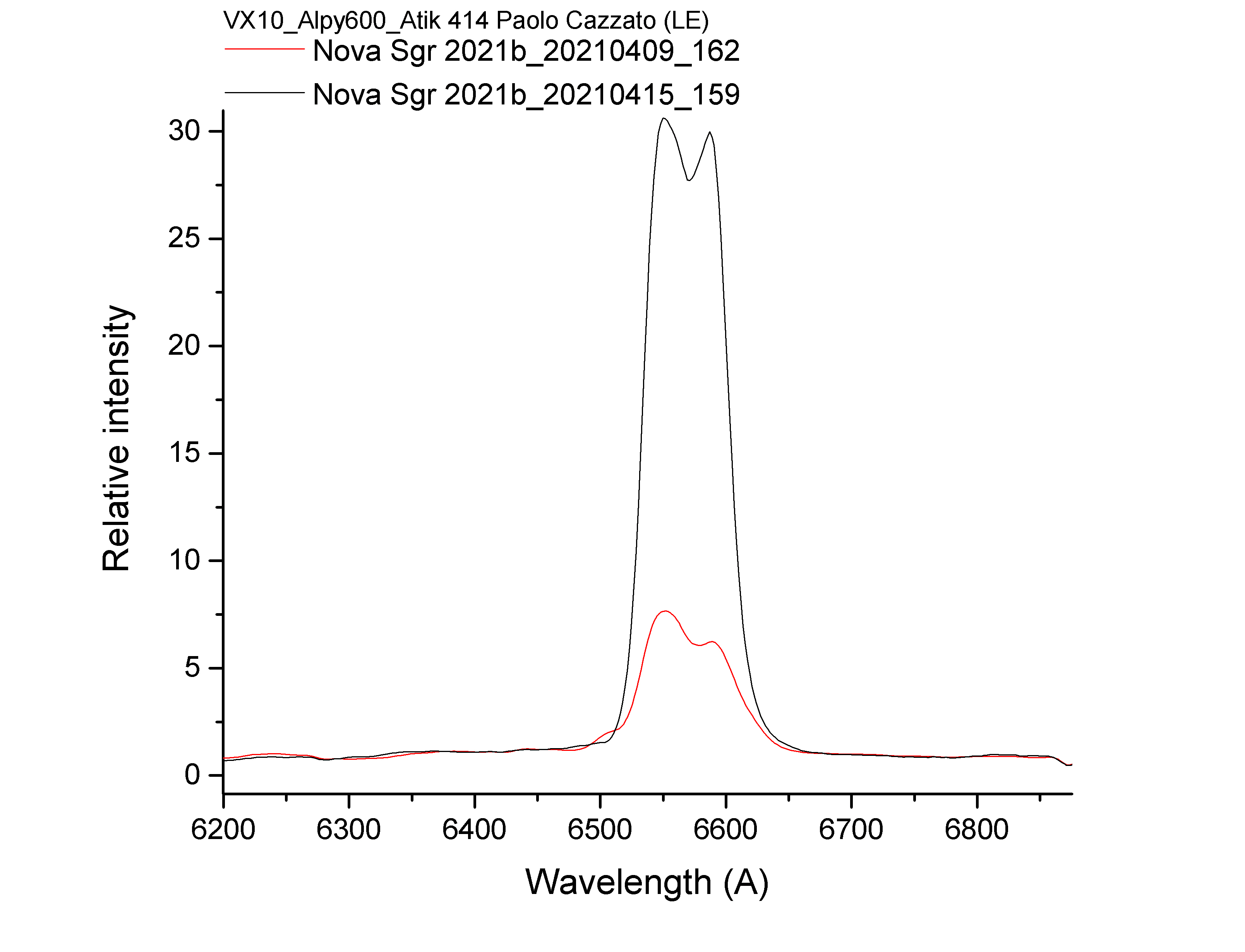 here my comparison at low resolution of this Nova taken from 3800A to 7900A. At low resolution I noticed an incrase of the basic lines and a splitting of the h alpha line. I also noticed an incrise of the OI (?) line at the extreme end of the spectrum. Would it be possible an overlap of the Mg line at 7890A in your opinion?