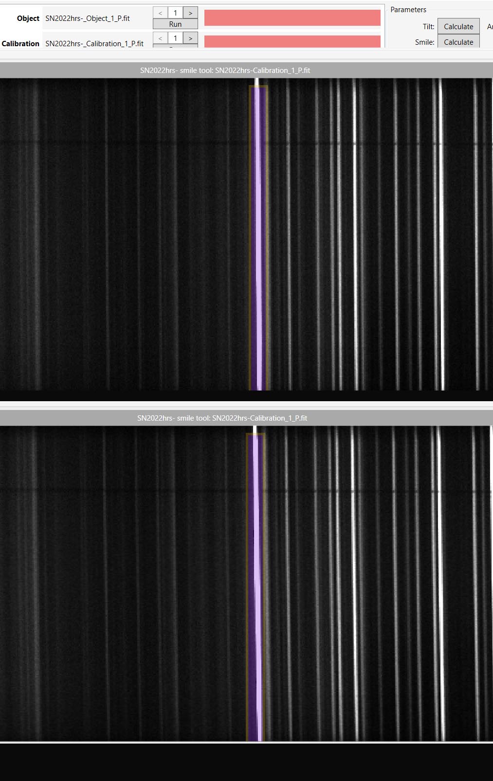 Yes, i selected an area around a line while trying smile correction. But smile just fixes the curvature of the line, not its slant. I recently knew that Demetra does not correcft for slant. I suppose slant is already taken care of by fixing the slit correctly with the screws, mechanically, and following the procedure stated in the manual. I guess this is the best means, but whenever the slit is changed, the procedure must be done again as the square mirror (the slit) emplacement has some play, it does not sit snuggly. It does not fit exactly in its location. You may try either moving just very slightly the mirror with a small pick until no slant is observed or -better- dismount the spectroscope from the telescope and use those screws to fix it. The manual states that the guider should be used for this correction. I wonder -i did not try it yet- if could it be a good idea to use the calibrating lamp an its spectral lines -using the main camera- to perform this correction by checking the lines verticallity. Also with this procedure it is easy to check if at the acquisition camera's chip the spectrum is horizontal and is placed at its very center.