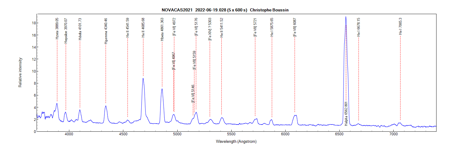 I'm back with a new spectrum of the Nova Cas 2021 obtained the 19th of June at 0 h 40 TU (resolution of 542, JJ = 2459749.528) with my Alpy 600 and an acquisition time of 50 min (5 x 600s) :