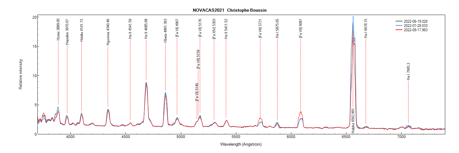 With delay, here is a new spectrum of the Nova Cas 2021 obtained the 17th of September at 23 h 07 TU (resolution of 529, JJ = 2459840.4633) with my Alpy 600 and an acquisition time of 40 min (4 x 600s) :