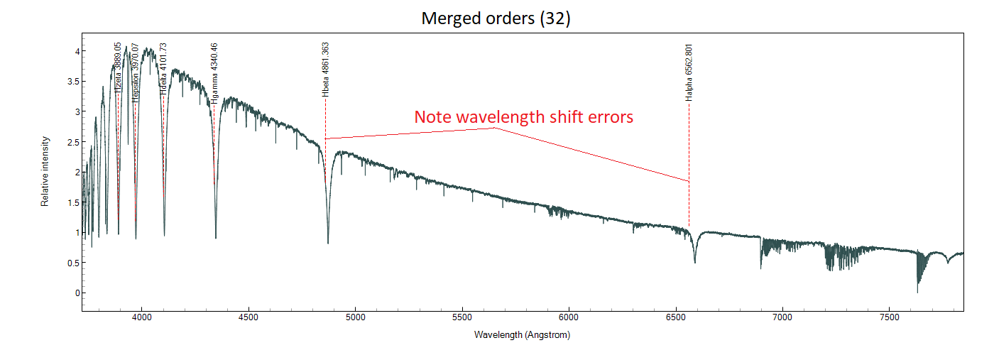The next problem is the merged orders spectrum made by ISIS. As the first image below shows, there is a significant wavelength shift or error, clearly shown by the Balmer lines. I've tried various software option but without success. Could it be caused by the 'cramped' spectrum image, or is it a bug?