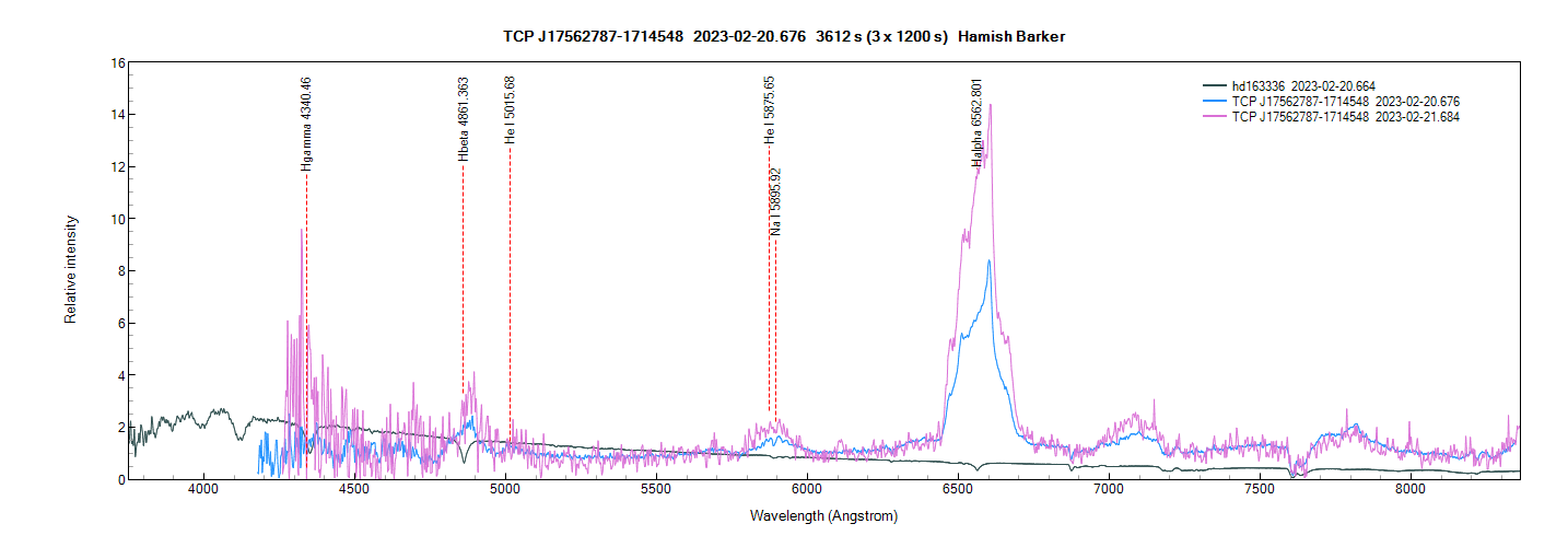 I took a spectrum this morning also. H alpha is massively broadened. Elias Aydi went so far as to describe it as "wild".