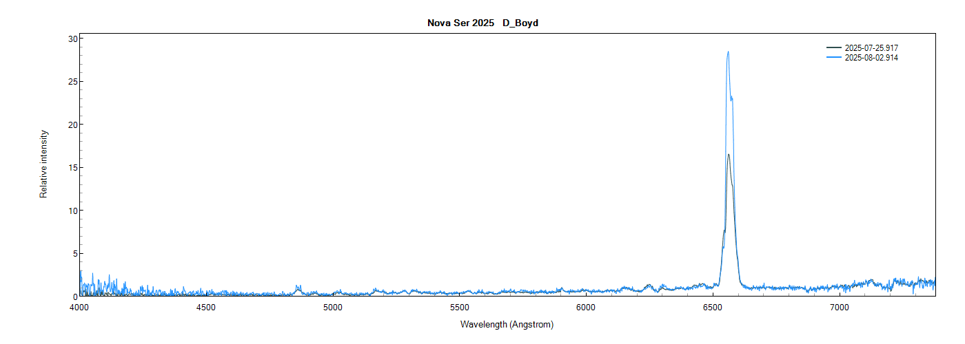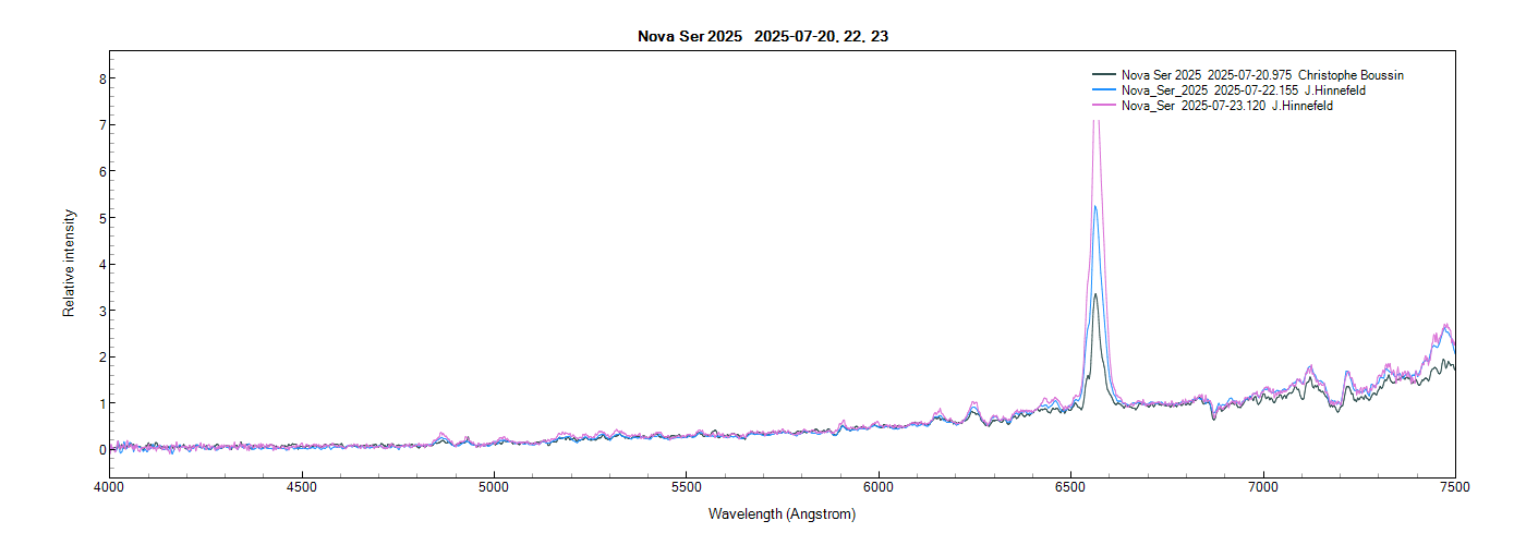 These three spectra of Nova Ser 2025 were collected at ~24 hr intervals, the first by Christophe Boussin and the other two by me, all with the Alpy 600. The three spectra have been added to the ARAS Spectral Database: https://aras-database.github.io/databas ... r2025.html