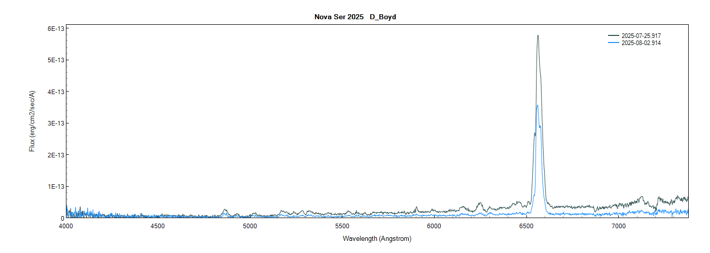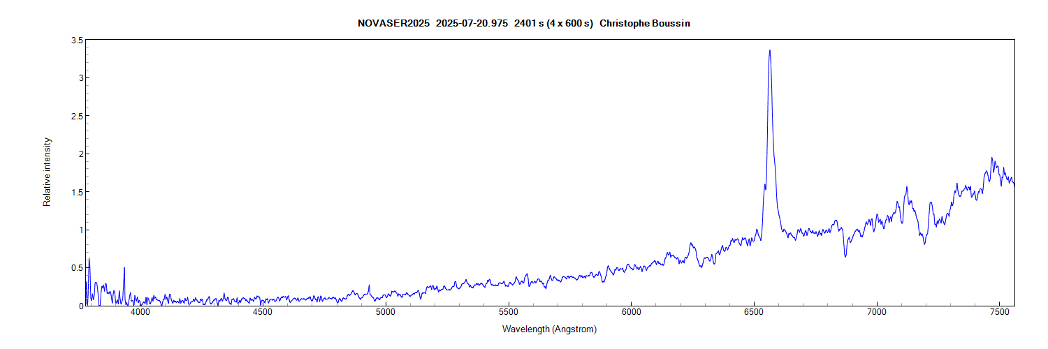 These three spectra of Nova Ser 2025 were collected at ~24 hr intervals, the first by Christophe Boussin and the other two by me, all with the Alpy 600. The three spectra have been added to the ARAS Spectral Database: https://aras-database.github.io/databas ... r2025.html