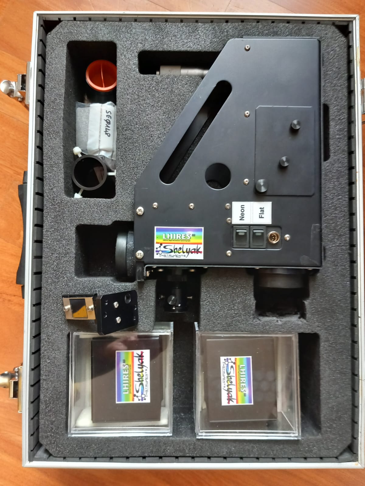 Bonjour à tous. Je vends le spectroscope Lhires III complet avec réseau 2400 L/mm, multi-fentes (15-19-23-35 µm), réseau 150 L/mm, réseau 600 L/mm, multi-fentes avec support (23-27-31-35 µm), adaptateur pour caméra de guidage Lodestar, alimentation 12 V, 3 lampes argon-néon de rechange, kit d'adaptateurs pour caméra et oculaire. Tout est comme neuf. (Photo jointe). Contact : umbertosollecchia@gmail.com