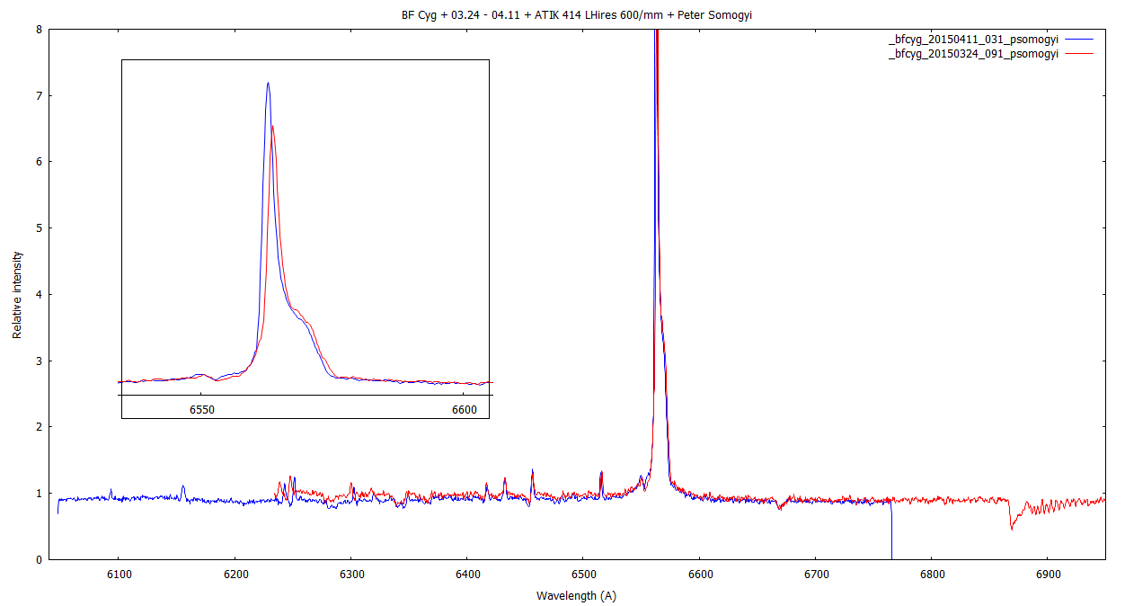 BF Cyg before yesterday (35um slit - this time managed to get only R~10000, 1.9 hours), arranged to bottom in a monthly view: