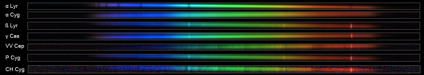 At the OHP I was able to get some nice spectra of VV Cep. Having an image at hand, probably helps to follow the discussion about spectral profiles of VV Cep, beta Lyr (shelyak), etc. So, I created a simple mount of certain raw stellar spectra, that I’ve taken at the OHP with my Vixen 8“ Cassegrain, Alpy 600 and modified Canon EOS 60D DSLR with Astronomik UV/IR L-Filter. Although, wavelength range is uncalibrated, Balmer lines of alpha Lyr will yield good watermarks for typical wavelengths of spectral properties.