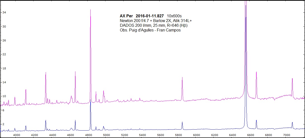 Ce dernier spectre, don't j'ai oublié de mettre les détails au graphique, est de Z And: pris le 2015-12-30.854, 8x600s, R:556 (H-beta). Même instrumental que les autres spectres.