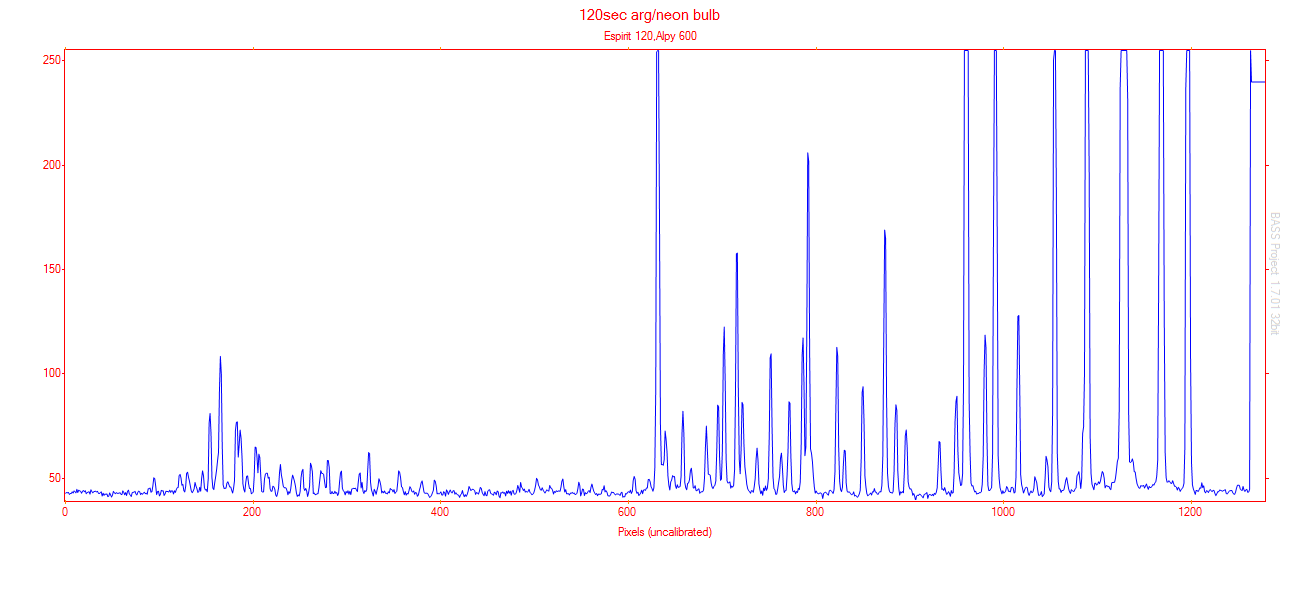 That's pretty much what I see too Steve (though my lamp is not positioned at the objective end). As Peter intimates though, there's not much at the blue end - and I'm curious to know if there's been much shared with respect to calibration lines since the Aply's release some years ago. I attempted to reconcile some of the smaller peaks at the blue end with on-line sources without much success - though despite that I'm now getting excellent correlation of the Balmer lines with published spectra using just 5 lines.