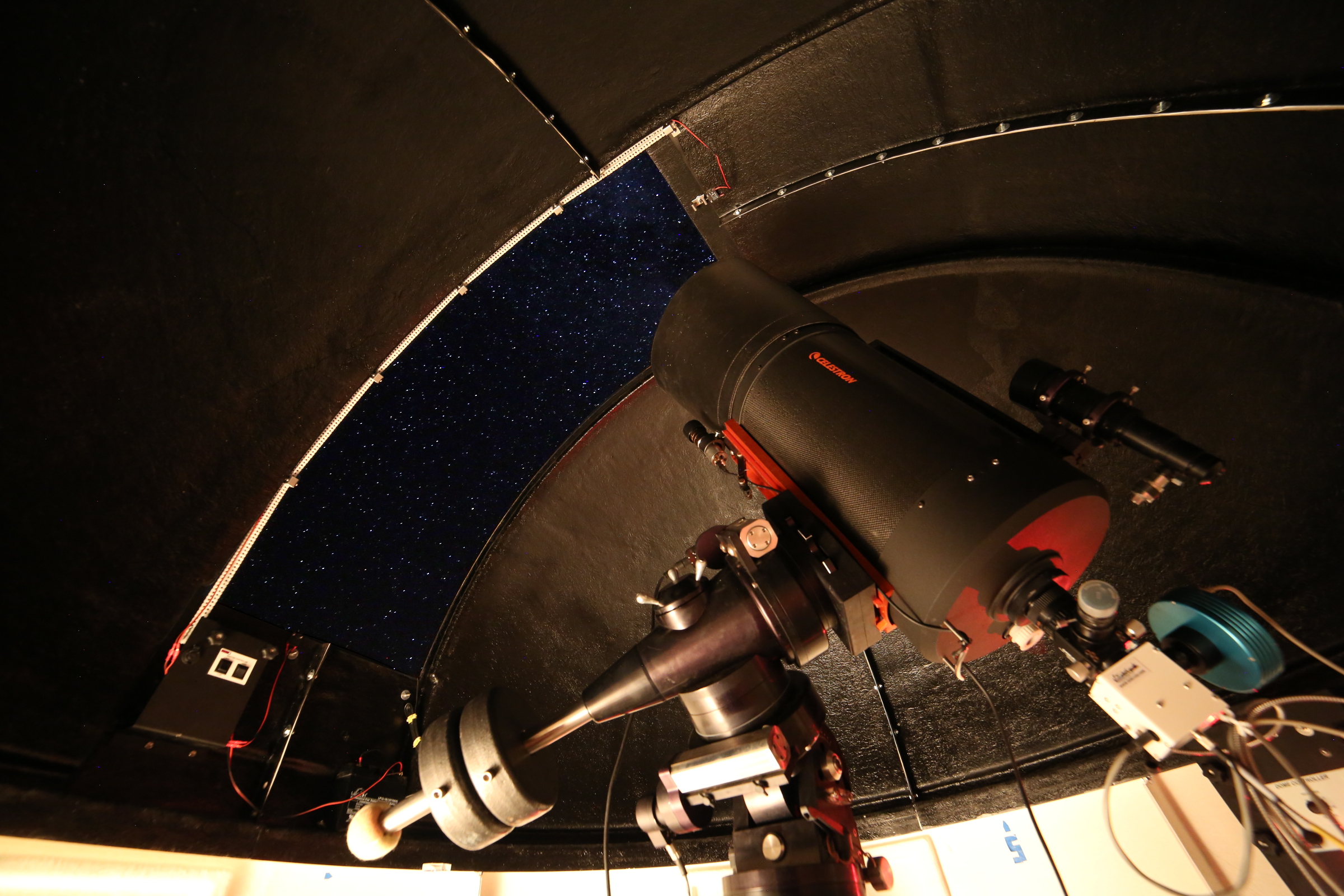 Here are also a couple of pictures taken outside showing the backyard observatory under clear skies, the telescope under the dome and the control room: