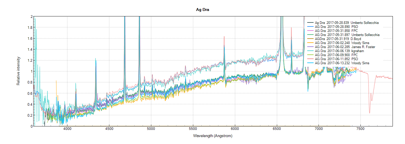 Anyway, to come back on your AG Dra subject, I did a quick survey of the last 11 low resolution inputs on Aras data base. It shows significant variation (object or measurement variation ?). This bring an other question : how to characterize the measurement error (or accuracy level) of the “instrumental response” ? Based on what I see in that example we may have to consider the possibility of a 10% error level in a large frequency band (3800-7200) with low resolution spectrograph.