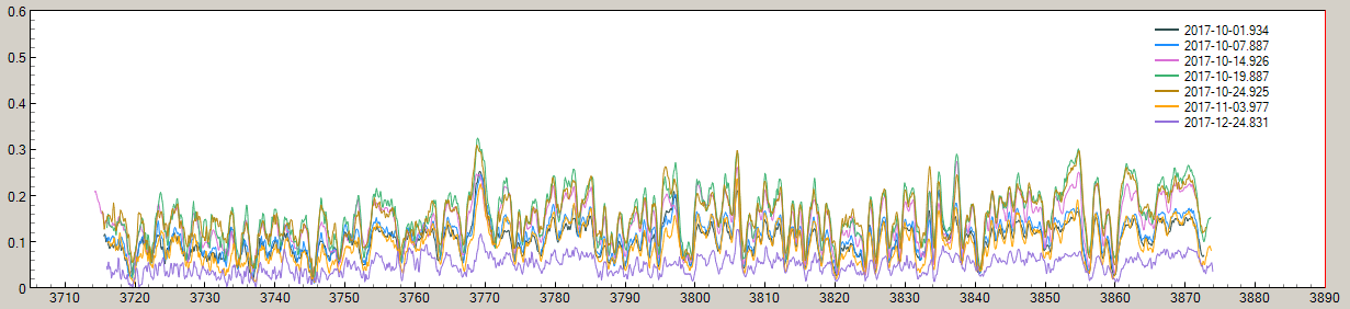 Preliminary result for the lower UV region (3705 - 3780), before eclipse: Surprise: the continuum itself seems to produce flux decrease events, based on these 3 spectra: Important: for spectrum of 08.07, I've been using the missing ref. star '7 cep' average from the next night on 08.15 (in fact, the '7 cep' curve 07.25, 08.15 and 08.18 are very similar by absolute ADU). This is a doubt remover that the flux decrement was coming from '7 cep'.