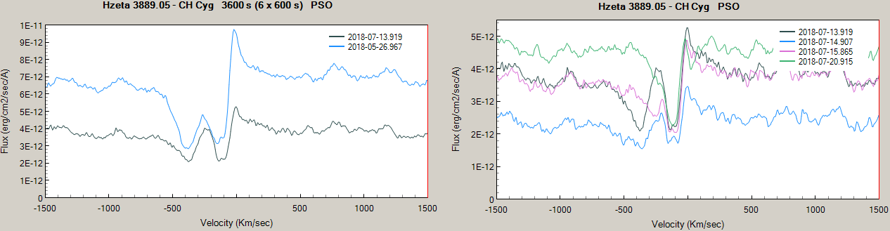 By fortune with yesterday session, I've got 2 spectra close by 1 week showing high & low state having their own flux (using the wide slit, ref.: Vega/calspec): Included my spectrum on 2018.07.07 which was in the middle of the earlier minima.