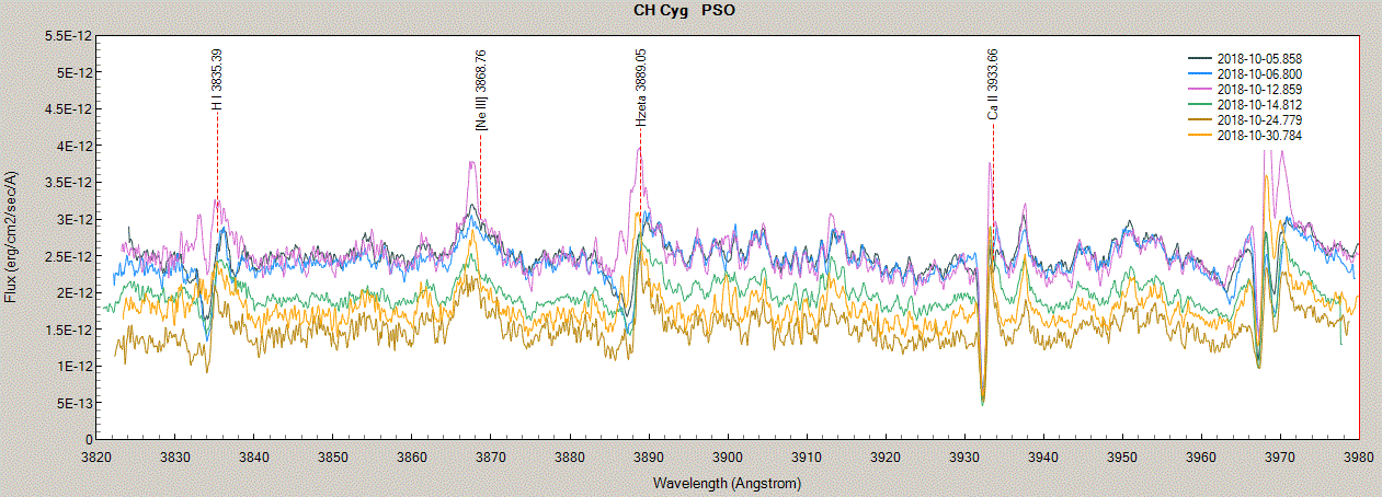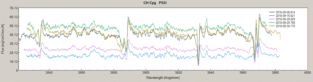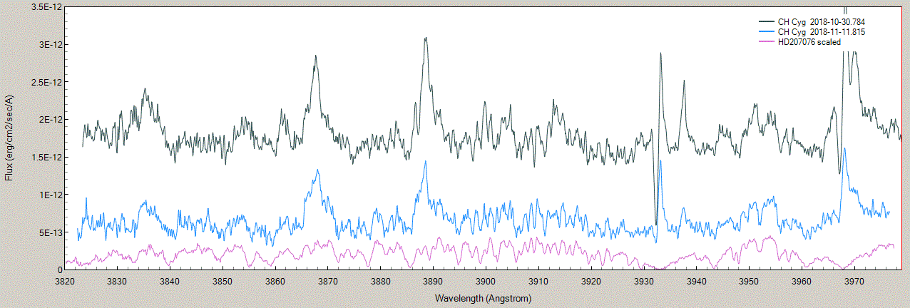 Just reporting a sudden flux drop of CH Cyg in the 3860-4000A range from OCT.30 to NOV.11, comparing to the previous low states: It was extremely hard, switched to 20 minute to get real photons at low ADUs (with clouds in between).