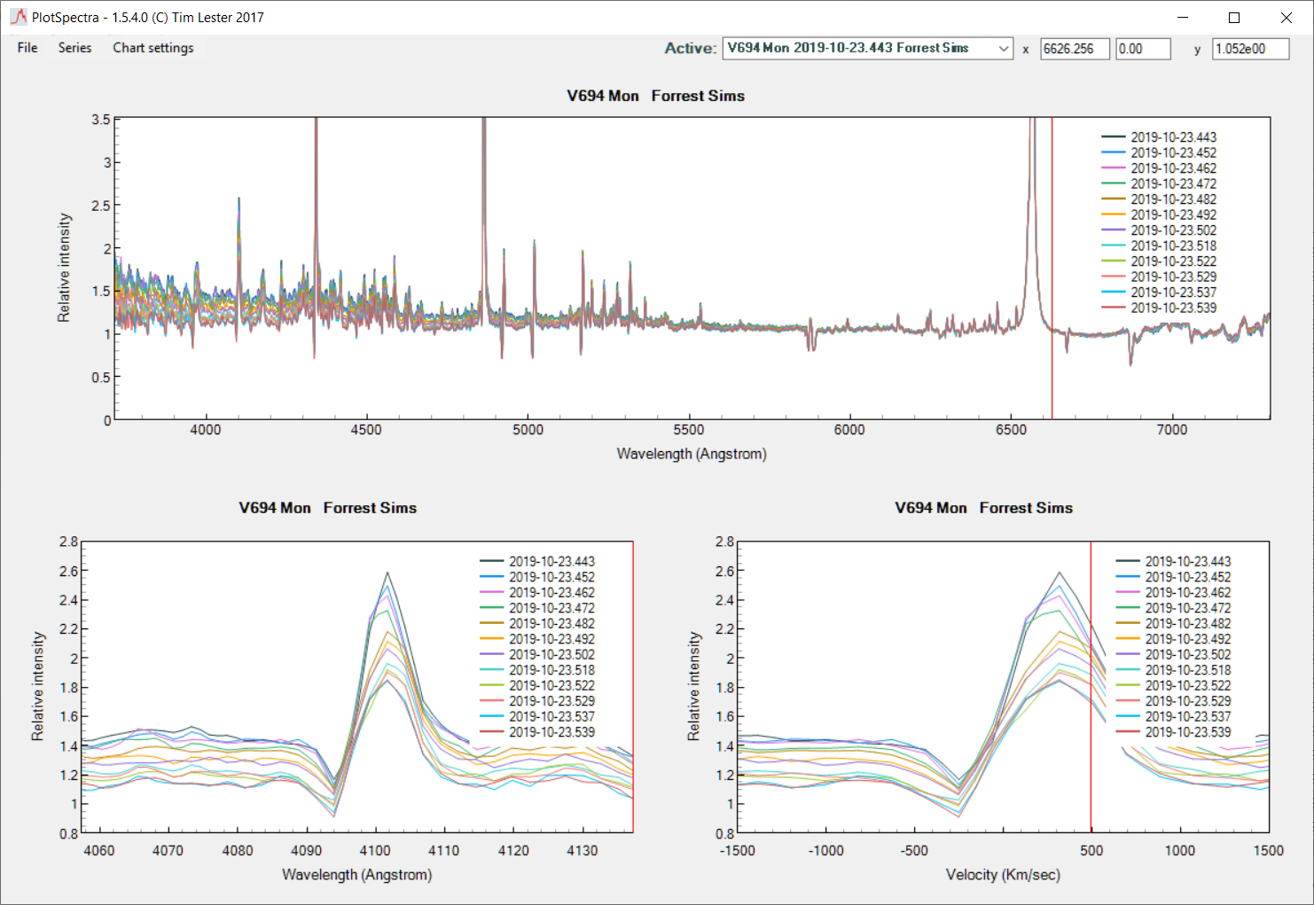 I was able to capture a sequence of spectra with my LISA of V694 Mon early morning before the HST window on the 23rd. I took 12 sequences of 7 images each starting with exposures of 120 seconds and ending with exposures of 80 seconds. Even so I still saturated Halpha in some of the sequence as the altitude increased and the sky brightened after astronomical dawn. Here are two PlotSpectra charts, the first one showing the 12 sequences with attention drawn to Hdelta at 4101.73 and the second one showing the PlotSpectra subplot for your HeI 4921.93 line. In the case of the Hdelta line, maybe there is some real change taking place over this several hour period. I suspect the general spread in the lines is due to having to choose one Reference star (therefore one Response curve) and apply it to all 12 sequences. But it still looks like there might be an amplitude change over time. And the other plot shows the HeI line Peter described but lower resolution than Peter's.