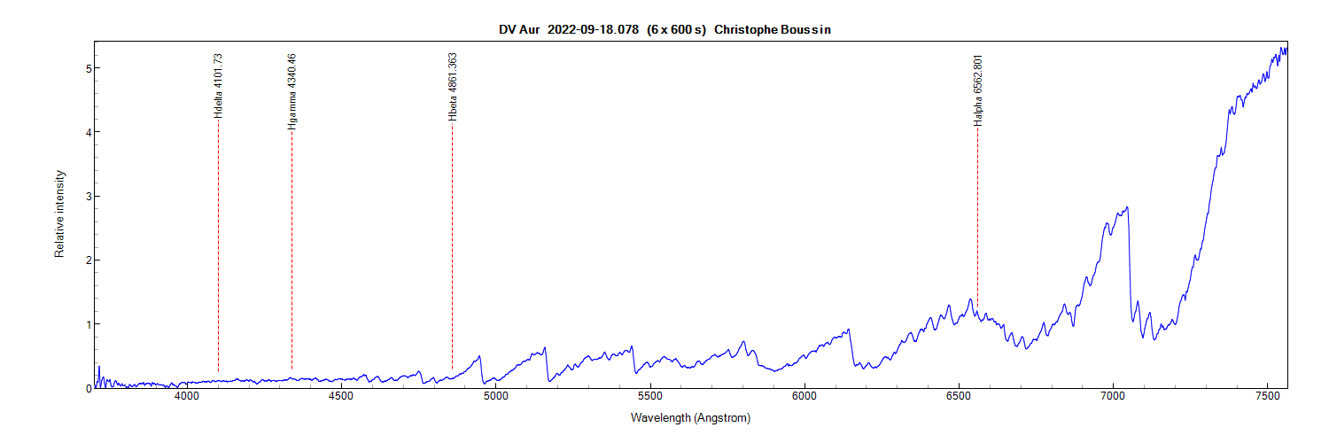 I obtained the following spectrum of DV Aur the 18th of September at 1 h 52 TU with my Alpy 600 (resolution of 509, JJ = 2459840.5781) and an acquisition time of 60 min (6 x 600s) :