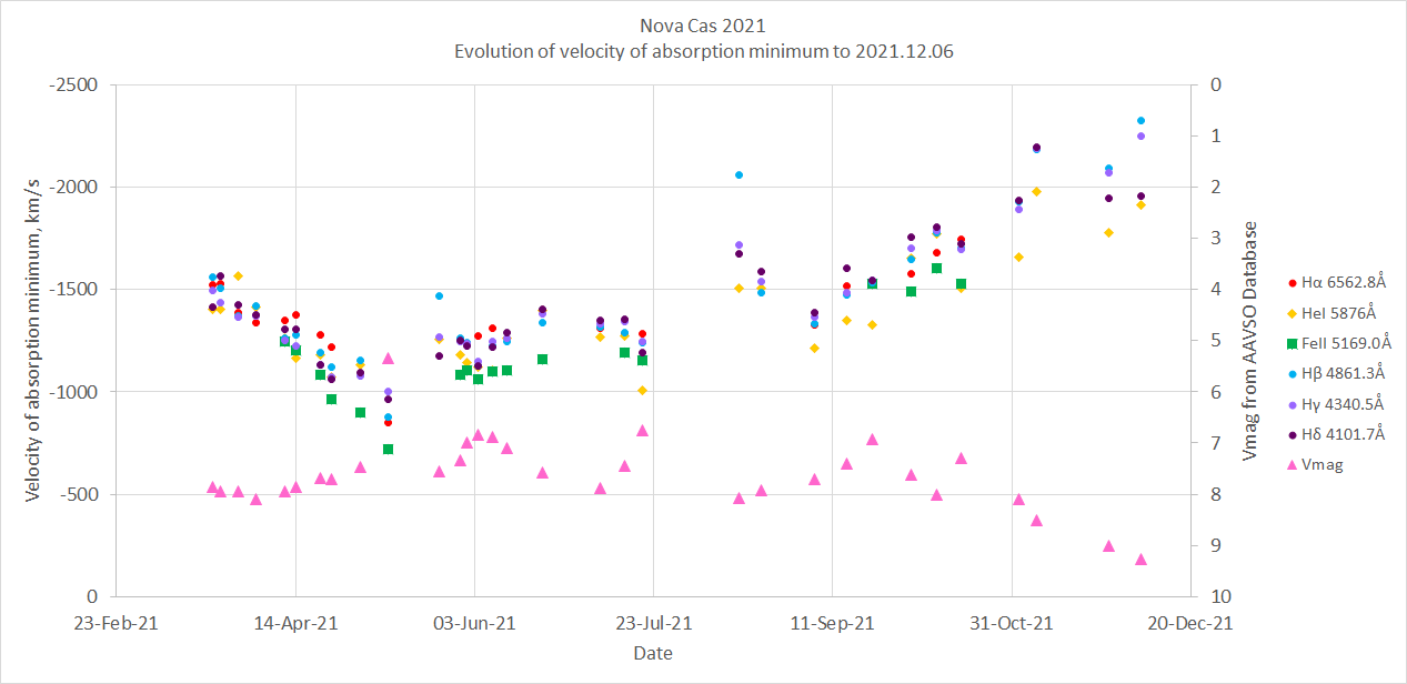 In spite of the English weather I have now captured 33 Alpy spectra of Nova Cas 2021, available in the ARAS and BAA databases. It is interesting to highlight the timing of the observations on the light curve from Vmag data in the AAVSO database: