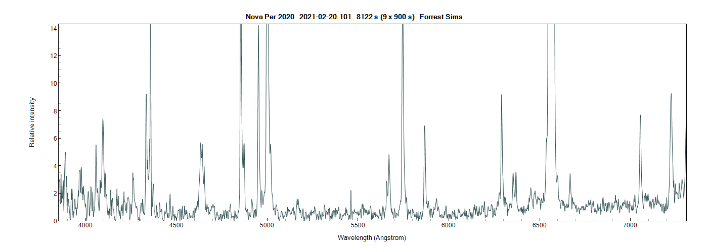 Nova Per 2020 with (9) 900 sec exposures. I have zoom in a bit in PlotSpectra to more clearly show the emission lines above the continuum.