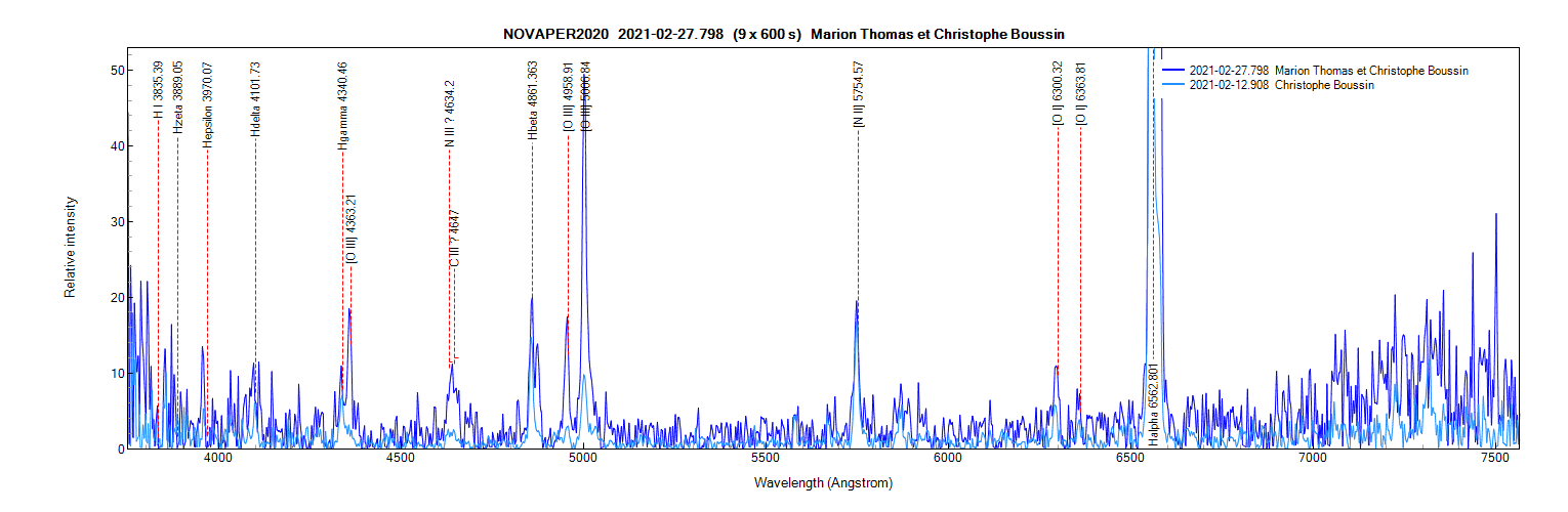Nova Per 2020 on February 12th and 27th, 2021 (identification of some lines from PlotSpectra)