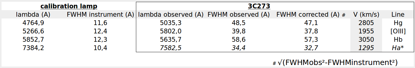 Etienne, détecter des variations dans le spectre de 3C273, une observation à tenter... Richard Walker avait peut être vu une évolution, voir https://pdfs.semanticscholar.org/6de4/2 ... ff7fae.pdf
