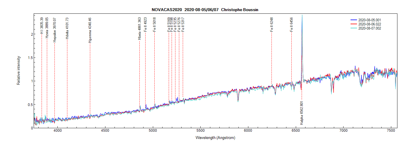 Nova Cas 2020 on August 5th, 6th and 7th, 2020 (identification of lines from PlotSpectra)