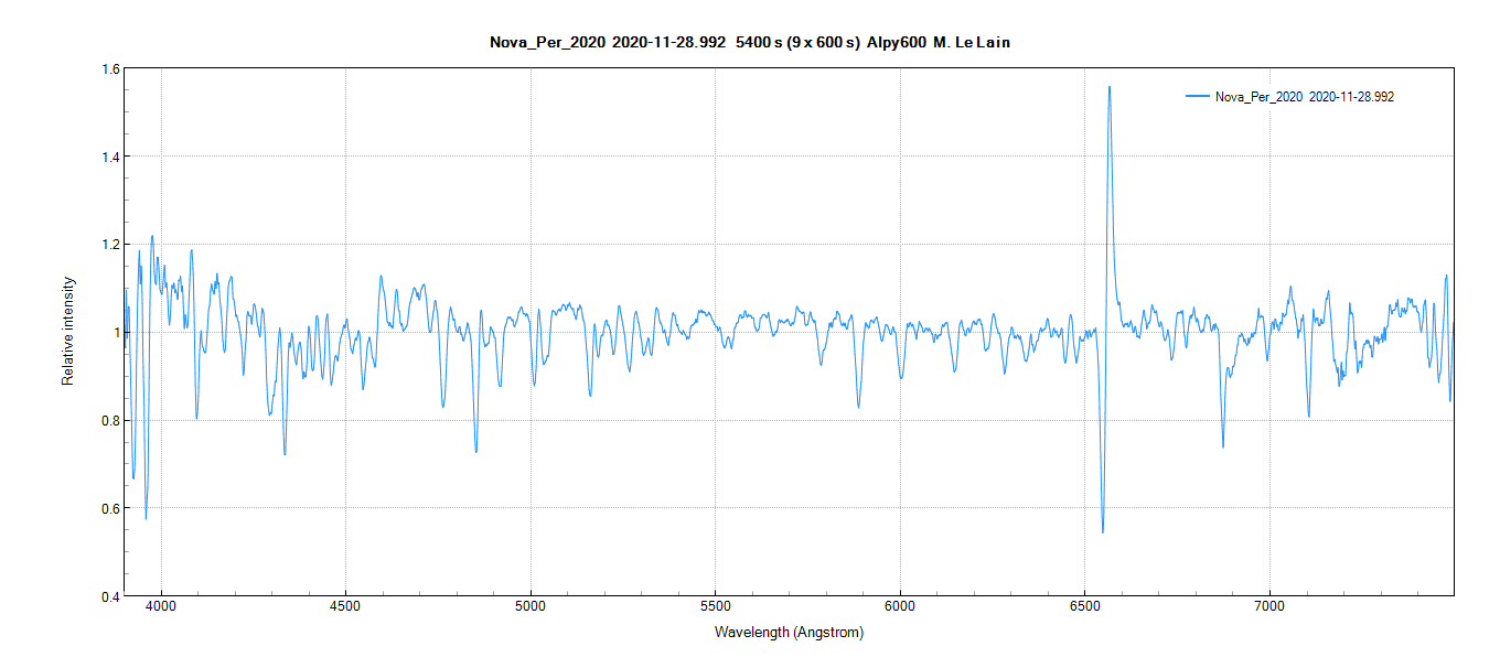 We obtained the following spectrum of nova Per 2020 the 27th of November at 22 h 25 TU with an Alpy 600 (resolution of 506, JJ = 2459181.4758) and an acquisition time of 60 min :