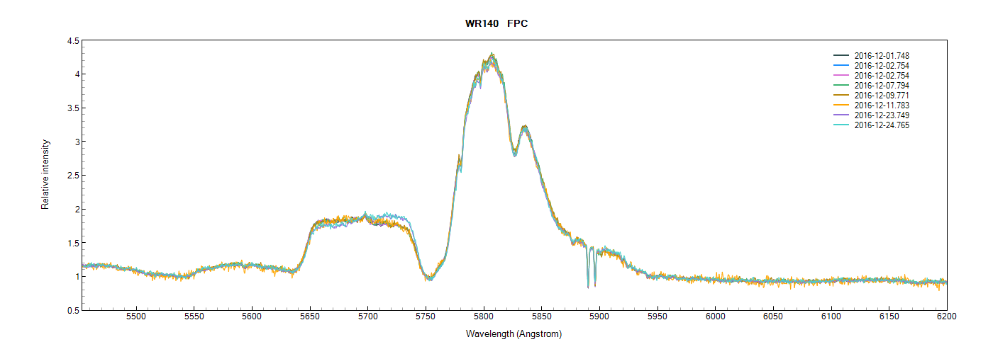 I attach a New Year animation I made in the carbon III emission region, from spectra obtained with my Alpy 600. I wanted to get more spectra in the approach to periastron but weather and opportunity conspired against me. However I think increased emission is clearly visible on 30th November, blue-shifting once periastron is past. I processed the spectra in RSpec but was not confident in obtaining a consistent rectification. So I used the average intensity between 5600-5630 Angstroms as the anchor point for each spectrum. If the weather improves here in Southwest England then I will obtain more spectra to complete the animation