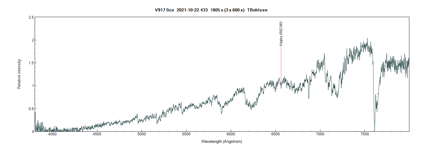 I obtained spectra for V618 Sgr on 18 and 19 October 2021. I have attached the spectrum for 19 October 2021 - the 18 October observation was in close agreement with this. It represents 1.5 hours taken with a UVEX mounted on a PW CDK 12.5. ISIS reports the resolution as 1461. SNR is around 45 - 50. I measured a V mag of 9.54 with simultaneous photometry. The spectrum has been adjusted to reflect this.