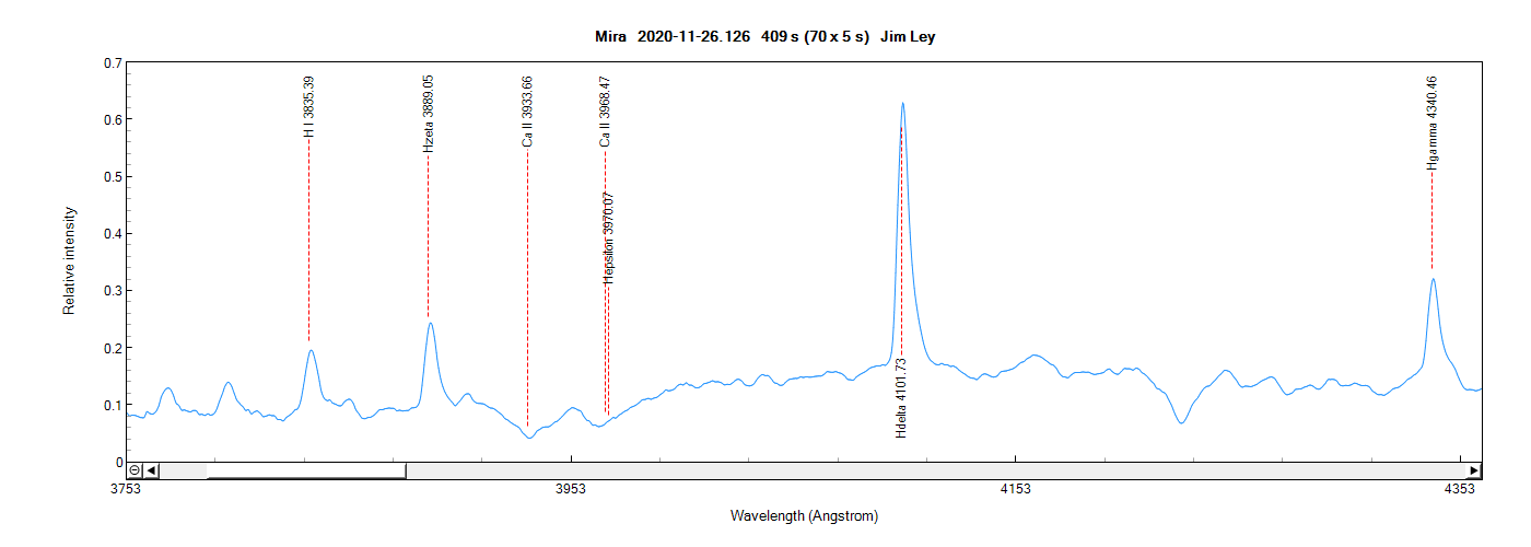 Si l'on regarde le spectre de Mira On voit que l'émission à H-epsilon (397,0 nm) est absorbée par Ca II H (396,8 nm). Je pense que cela provoque une émission dans le triplet de calcium.