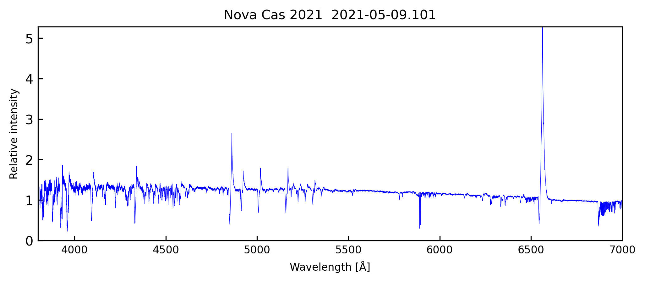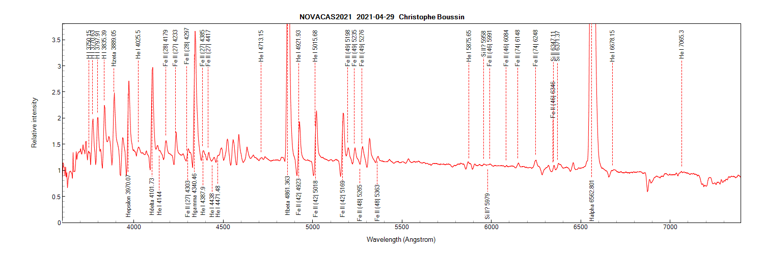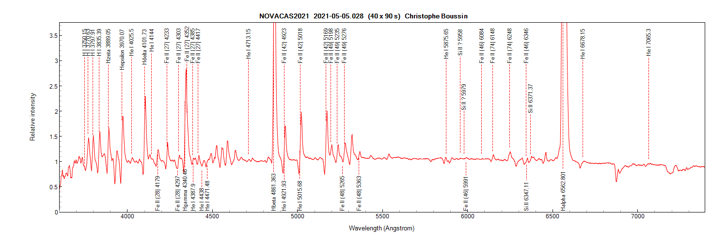 Alpy 600 spectrum from this evening 2021.05.02. The FeII lines continue to strengthen and the P Cygni profile on the H alpha emission has now disappeared at the Alpy resolution: