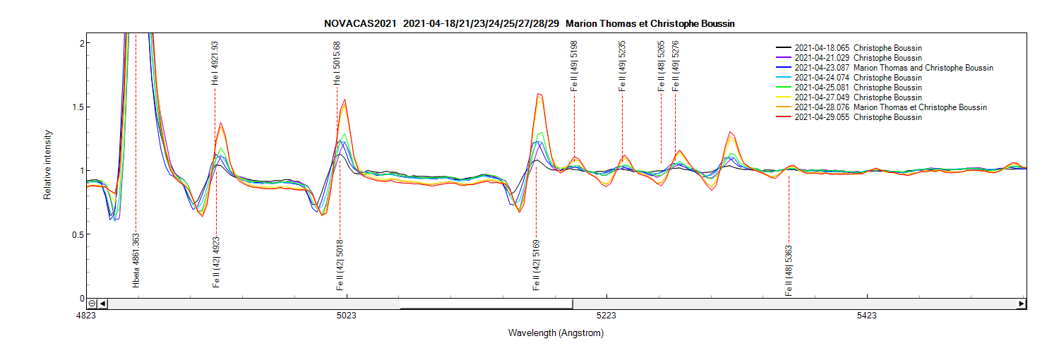 Fe II (42) lines on April 18th, 21th, 23th,24th, 25th, 27th, 28th, 29 th and May 5th 2021(zoom)