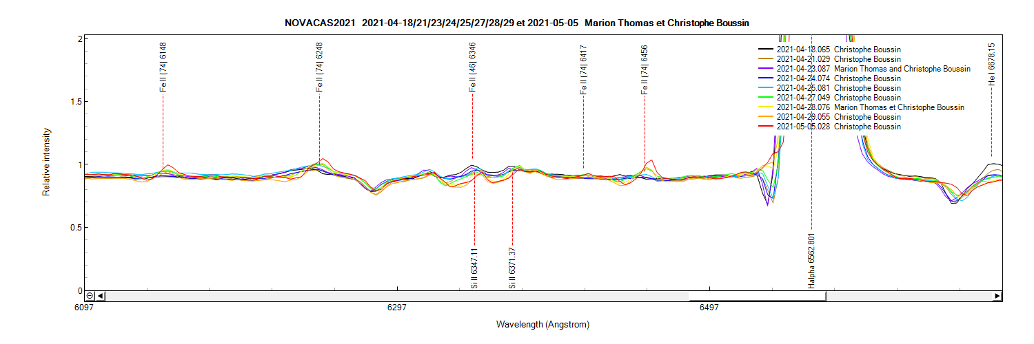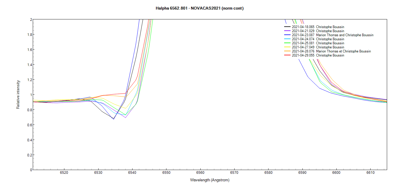 The evolution of Balmer lines continues as we can see on this enlargement of the Halpha line at low resolution between April 18 and May 5 :