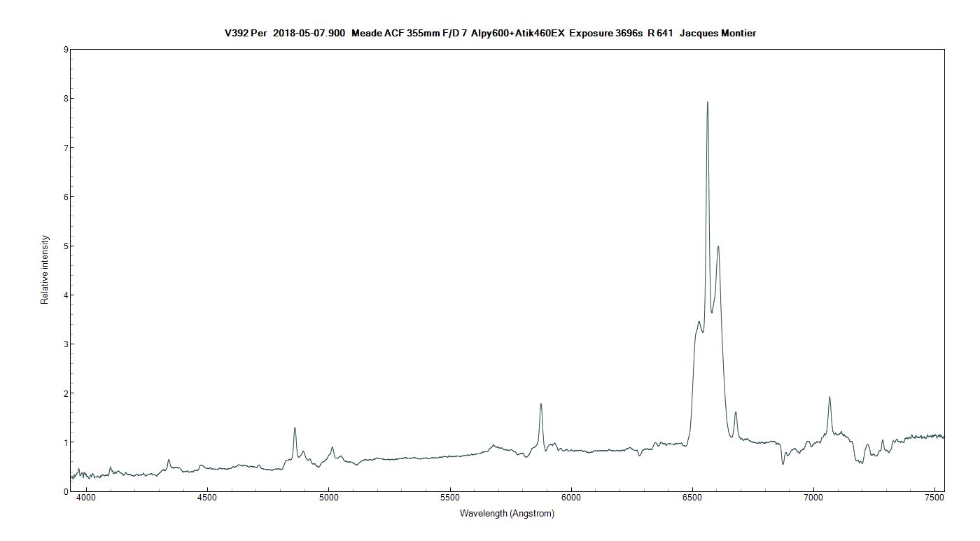 Le spectre ci-dessous a été obtenu le 4 Mai à 20 h 58 TU avec une résolution de 509 (JJ = 2458243.386) et une durée d'acquisition de 35 min (7 x 300 s).