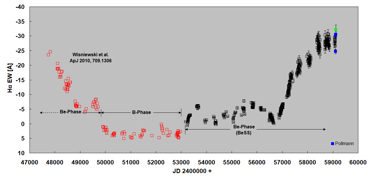 I don't think this one is in BeSS yet. This is a Be + sdO binary (Porb = 93.8 d) that is observed nearly edge-on and has some really interesting features (info in this paper if you're interested, https://ui.adsabs.harvard.edu/abs/2018ApJ...865...76C/). For one, in that 2018 paper observations show a clear accretion disk around the secondary. There are also dramatic shell profiles at certain phases in the orbit, which may indicate either disk warping, or structure in the z-direction in the disk, phase-locked to the binary orbit.