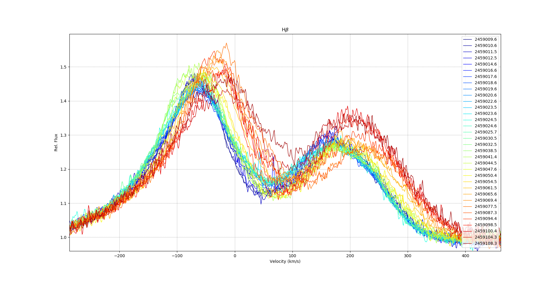 Just out of curiosity, have you measured the Halpha peak separation to see how that changes over the orbit? Some other similar systems I'm aware of have the peak separation follow a sinusoid at half the orbital period due to the density structure of the disk. At some point this will be done with the NRES spectra, which I think will be a useful quantity for Amanda's models of the disk, but so far I haven't done any sort of quantitative measurements.
